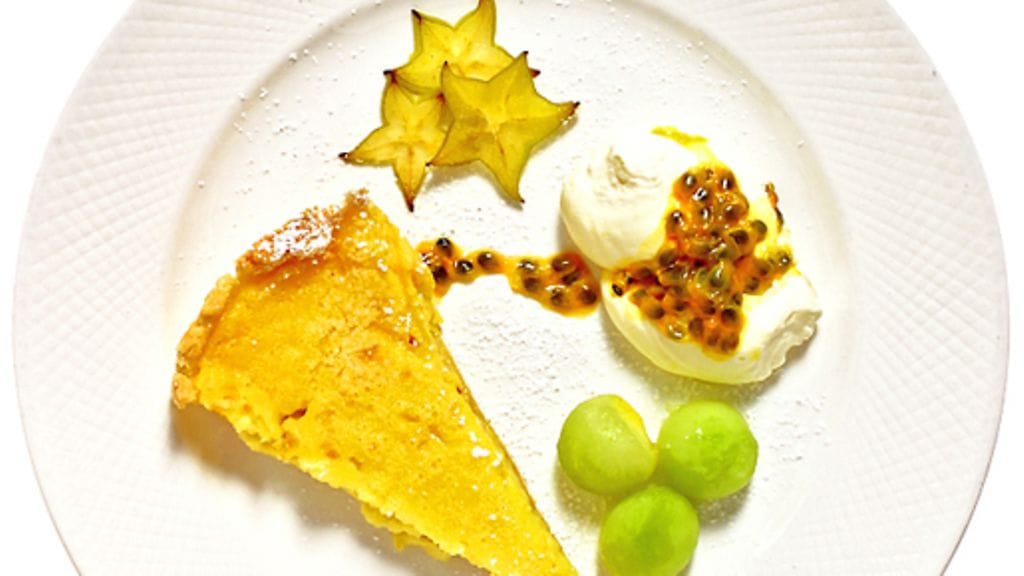 3. Vatkaa kerma. Raaputa passiohedelmästä siemenet ja sekoita kermavaahdon kanssa. Säästä muutama siemen koristeluun. Viipaloi karambola. Koristele jokainen piiraspala karambolalla ja melonikuulilla. Tarjoile kerman kera.