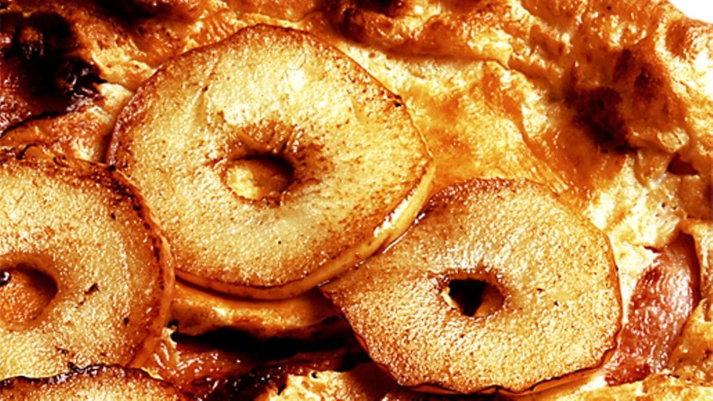 3. Poista siemenkota omenasta ja viipaloi omena. Paista omenaviipaleet kauniin kullanruskeiksi ruokarasvassa. Aseta omenaviipaleet kakun päälle ja tarjoile lisänä puolukkasurvosta.