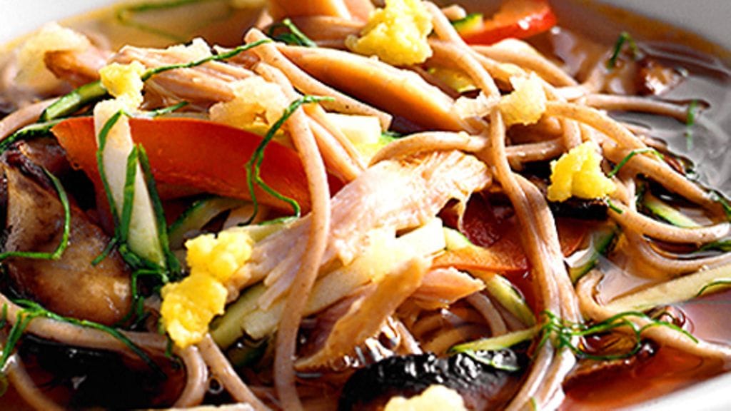 2. Irrota broilerinliha luista ja leikkaa pieniksi paloiksi. Puhdista ja suikaloi paprika, kesäkurpitsa ja sienet. Keitä nuudelit pakkauksen ohjeen mukaan. Kiehauta sieniliemi ja lisää siihen paprika-, kesäkurpitsa- ja sienisuikaleet, keitä kypsiksi. Lisää broilerinliha ja anna lämmetä.