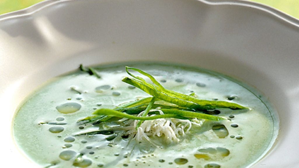 1. Kiehauta vihannesliemi. Poista herneistä kovat kannat ja pane ne kiehumaan liemeen 3-4 minuutiksi. Soseuta herneet liemineen monitoimikoneessa tai tehosekoittimella aivan sileäksi. Mausta sherryllä, suolalla ja pippurilla.