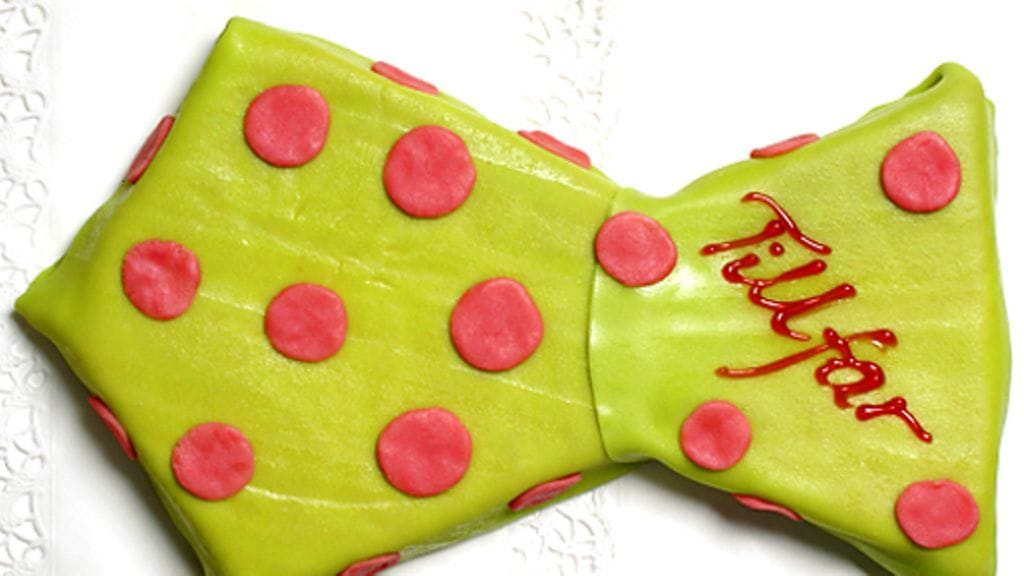 3. Aseta marsipaanikansi tortun päälle, kääntele reunat solmion alle. Jos marsipaania on liikaa, ylimääräiset voi leikata pois. Koristele kakunkoristein.