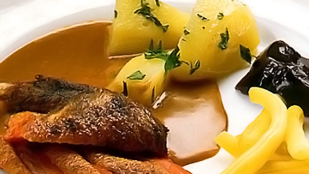 2. Kastike: Kuori sipuli ja porkkana, pieni ne palasiksi. Paloittele myös lintujen rangat vähän pienemmiksi ja keitä niitä yhdessä sipulin ja porkkanan kanssa veden ja viinin sekoituksessa noin tunti. Siivilöi kastikepohja. Keitä sitä kokoon yhdessä kerman kanssa muutama minuutti kovalla lämmöllä. Mausta hyytelöllä, konjakilla ja mahdollisesti suolalla ja pippurilla. Suurusta vesitilkkaan sekoitetulla maissitärkkelyksellä ja keitä kastiketta vielä muutama minuutti.
