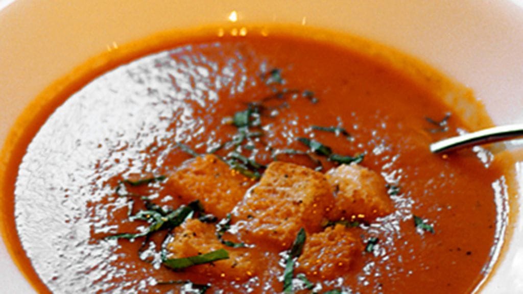 3. Kaada päälle tomaattimurska ja vesi, kuumenna kiehuvaksi. Lisää liemikuutiot, porkkanat ja perunat. Keitä vihannekset pehmeiksi. Soseuta keitto vähän kerrallaan, kaada takaisin pataan. Kuumenna kiehuvaksi ennen tarjoilua. Tarjoile leipäkrutonkien kera.