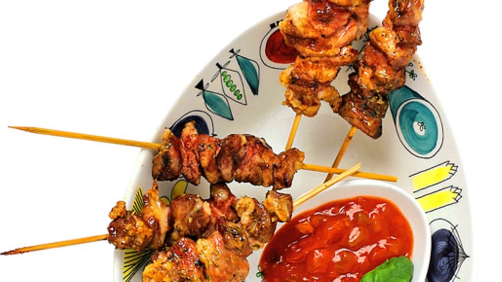 - Grillaa vartaat nopeasti kuumalla paistinpannulla niin, että lihat saavat kauniin värin. Jatka kypsentämistä uunissa 10 minuuttia.