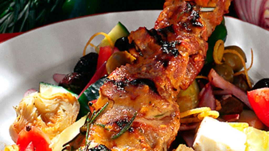 1. Pane grillitikut likoamaan veteen 30 minuutiksi. Leikkaa liha kuutioiksi. Kuori valkosipulinkynnet. Sekoita keskenään sitruunamehu, oliiviöljy, rosmariini, meirami, suola ja pippuri. Purista joukkoon valkosipuli. Kaada puolet marinadista muovipussiin ja laita siihen lihakuutiot. Säästä toinen puoli salaattia varten. Marinoi lihaa 30 minuuttia. Kääntele pussia.