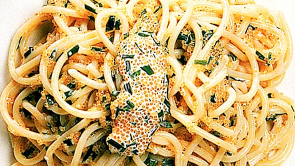 3. Sekoita hyvin valutettu spagetti ja mätisekoitus varovaisesti isossa kulhossa, tarjoile.