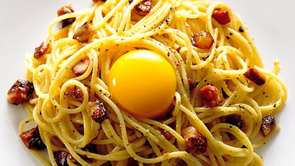 3. Vatkaa kananmunasta, kermasta ja suolasta vaahtoisa seos. Sekoita joukkoon juustoraaste. Sekoita kananmunaseos pastan joukkoon. Ripottele joukkoon paistettu pekoni ja rouhi pinnalle reilusti mustapippuria. Tarjoa munankeltuaisen kera.