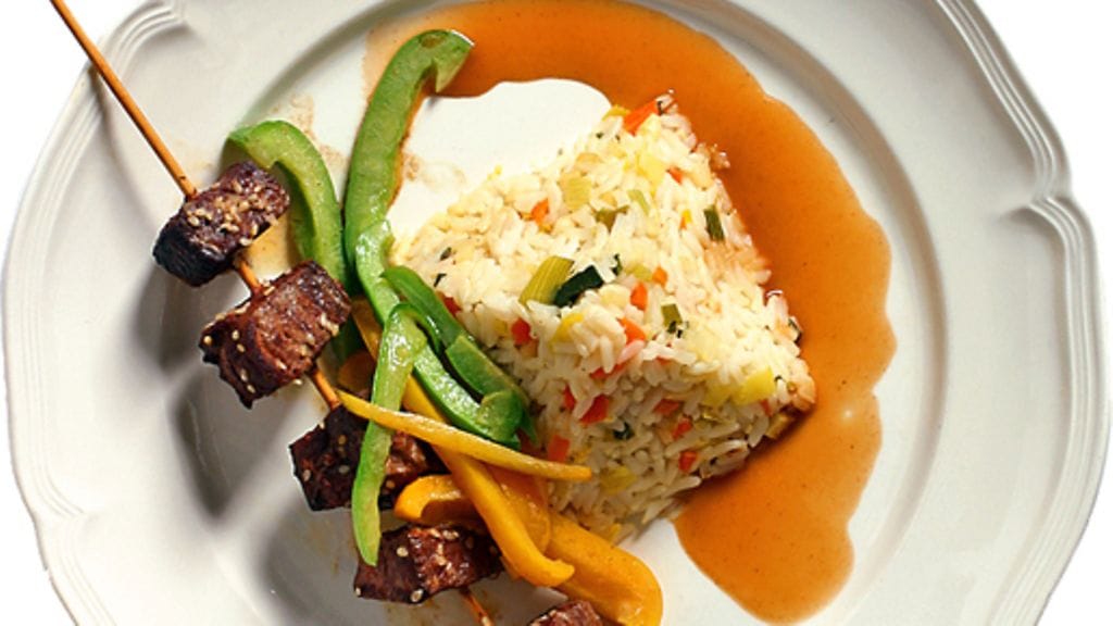 1. Vartaat: Purista valkosipuli öljyyn, mausta paprikajauheella ja currylla. Kuutioi strutsinliha ja laita marinadiin, marinoi n. 1 tunti. Tee kuutioista vartaita ja ripottele päälle seesaminsiemeniä. Mausta suolalla. Grillaus uunissa: Kuumenna uuni 175 asteeseen. Ruskista vartaat paistinpannulla voissa. Jälkipaista uunissa n. 8 minuuttia tai kunnes liha on läpikypsää. Grillaus hiiligrillillä: Anna lihan saada väriä lähellä hiillosta. Nosta sitten ritilää ja grillaa vartaat valmiiksi kaukana hiilloksesta, n. 5-8 minuuttia. Kääntele vartaita moneen otteeseen.