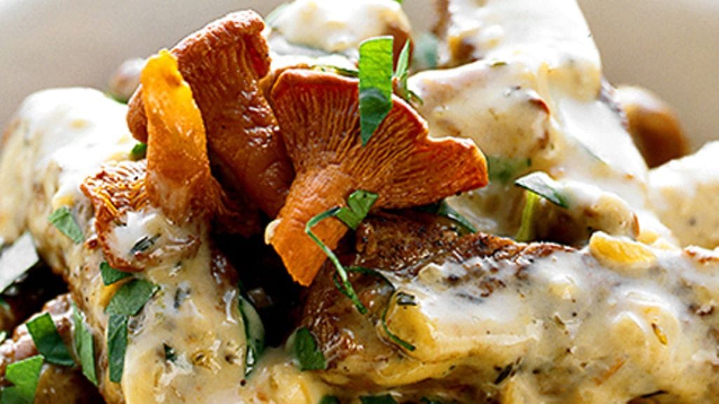 2. Siirrä sipulisilppu pataan, ripottele päälle jauhoa ja sekoita. Laita pata kuumalle liedelle ja lisää koko ajan sekoittaen maitoa vähän kerrallaan, sitten ranskankermaa. Lisää sienet joukkoon ja anna porista miedolla lämmöllä 5 minuuttia. Mausta suolalla ja valkopippurilla.