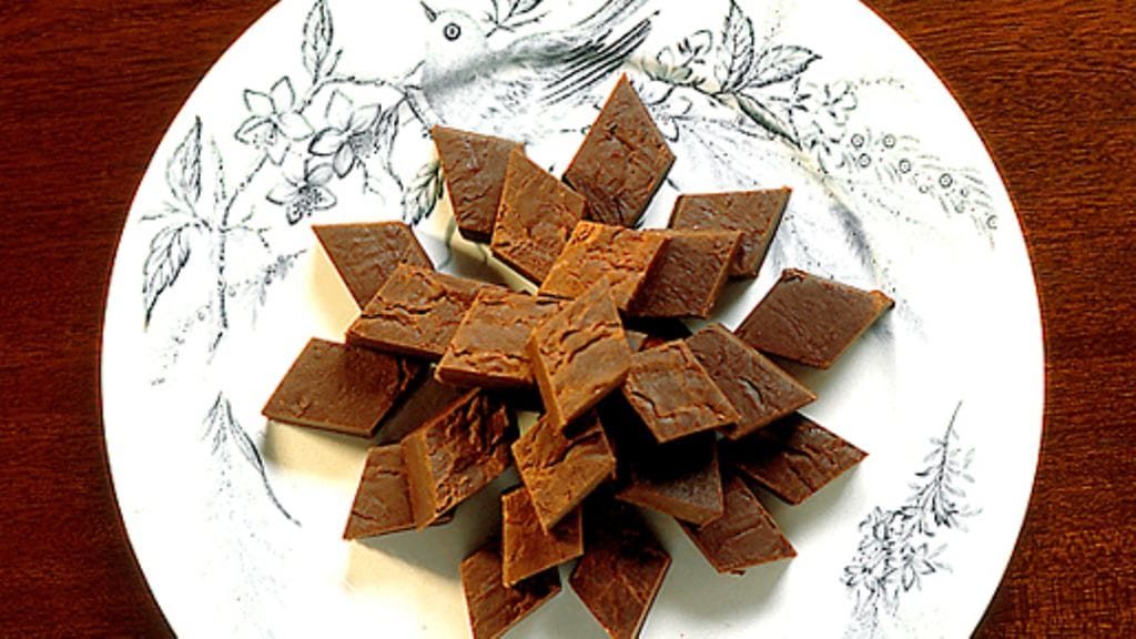 3. Lisää voi ja vaniljasokeri. Kaada seos kulhoon ja vatkaa sakeaksi. Vuoraa uunipannu voidellulla leivinpaperilla, kaada päälle toffeeseos ja levitä tasaiseksi. Leikkaa jäähtynyt seos neliöiksi.