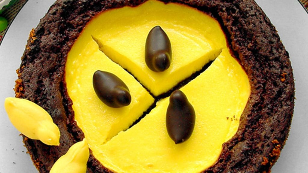 3. Ota vuoka uunista, kaada juustokakkutaikina vuokaan ja paista vielä n. 20 minuuttia 200 asteessa, aika riippuu hieman vuoan koosta. Kaiken pitää olla jähmettynyttä, mutta taikina saa olla hieman löysää, hieman kuin mutakakun koostumus.