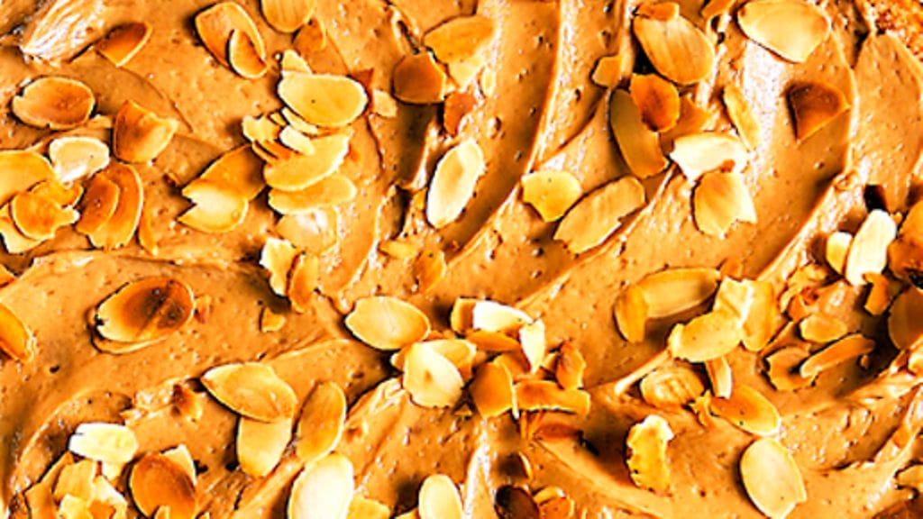 3. Levitä kreemi kakun päälle. Paahda mantelilastuja kuivassa pannussa. Koristele kakku niillä.