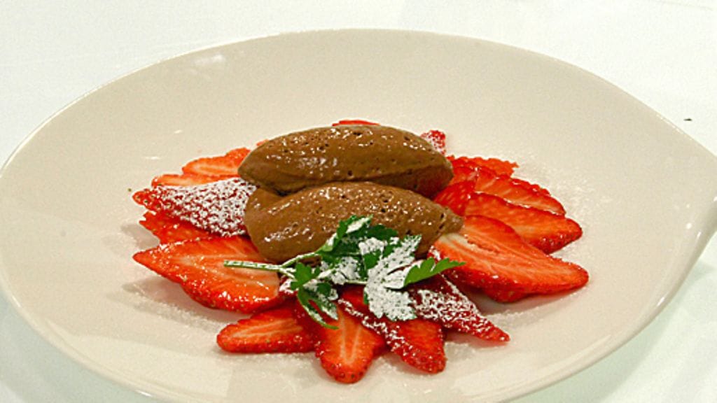 Leikkaa mansikat ohuen ohuiksi viipaleiksi ja asettele lautaselle. Sivele ne ohuelti hunajalla tai vaalealla siirapilla ja lusikoi hyytyneestä moussesta annospallo mansikoiden keskelle. Koristele tuoreella mintulla.