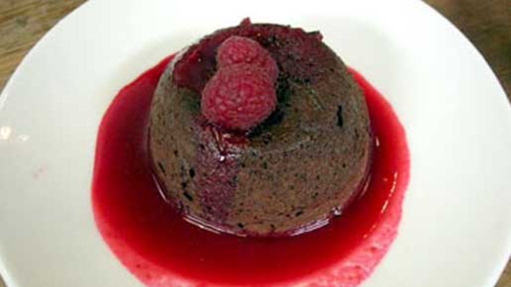 Laita kattilaan ¾ vadelmista, ruokalusikallinen sokeria ja kiehauta. Sekoita kunnolla ja siivilöi vadelmien siemenet. Siirrä vadelmakastike jääkaappiin. Erottele keltuaiset valkuaisista. Yhdistä keltuaiset ja sokeri, vatkaa kuohkeaksi. Lisää vehnäjauho ja sekoita hyvin. Sulata suklaa ja voi yhdessä, lisää seos taikinaan ja sekoita hyvin. Laita toiseen kulhoon valkuaiset ja ripaus suolaa, vatkaa kovaksi vaahdoksi. Yhdistä vaahto varovasti taikinaan. Voitele viisi pyöreää annoskulhoa ja täytä ne puoliksi taikinalla. Lisää keskelle 3–4 vadelmaa ja lisää päälle taikinaa, kunnes kolmannes kulhoista on täynnä.