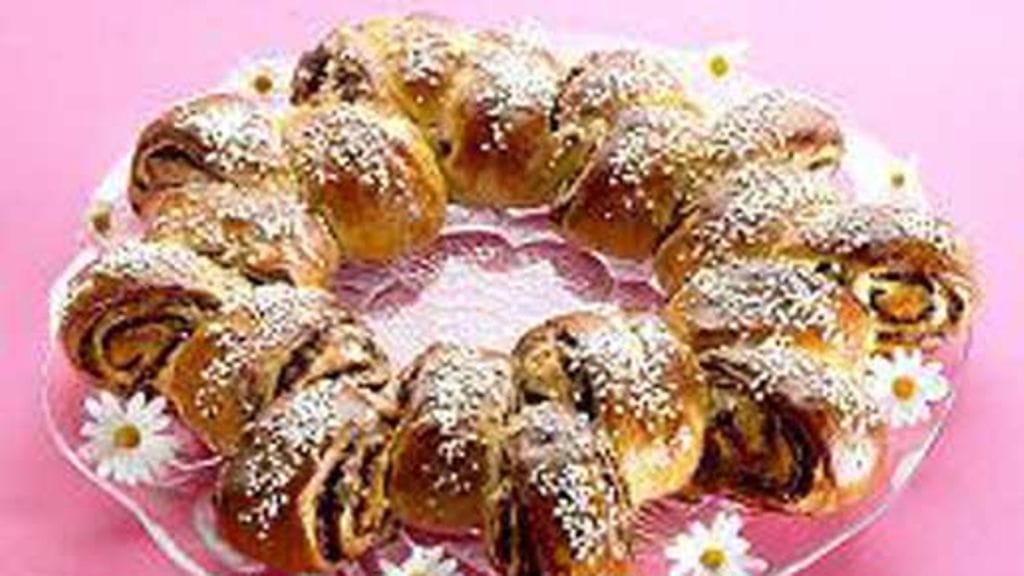 Kääri kerrostaikina rullalle kääretortun tapaan. Saksi pullaa reiluun puoleen väliin noin 1½ cm:n välien, mutta älä leikkaa rullasta viipaleita kokonaan irti. Näin saat pulla-suklaakeksitaikinasta ison kranssin kääntelemällä rullasta osittain irti leikatut viipaleet vuorotellen eri suuntiin ja kiertämällä koko rullan ympyräksi.