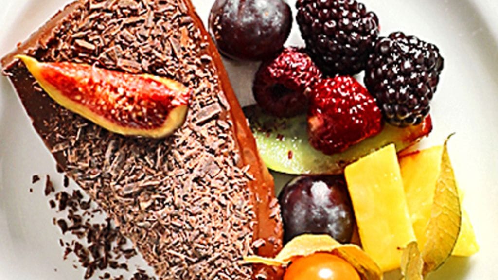 4. Raasta suklaata tortun päälle juustohöylän avulla, tarjoile tuoreiden marjojen kera.
