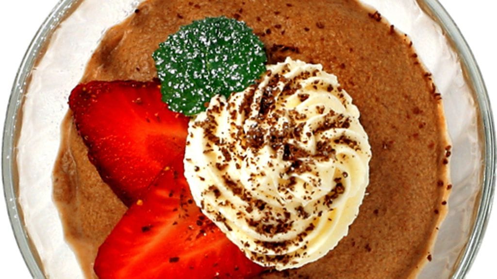 3. Vatkaa seosta, kunnes se jäähtyy. Sekoita varovasti kermavaahto ja valkuaiset suklaaseen ja kaada seos annosvuokiin. Nosta kylmään ja anna vanukkaan hyytyä. Tarjoile lisänä kermavaahtoa ja mansikoita, jos niitä on saatavilla. Koristele sitruunamelissalla, sirottele pinnalle hieman kaakaota.