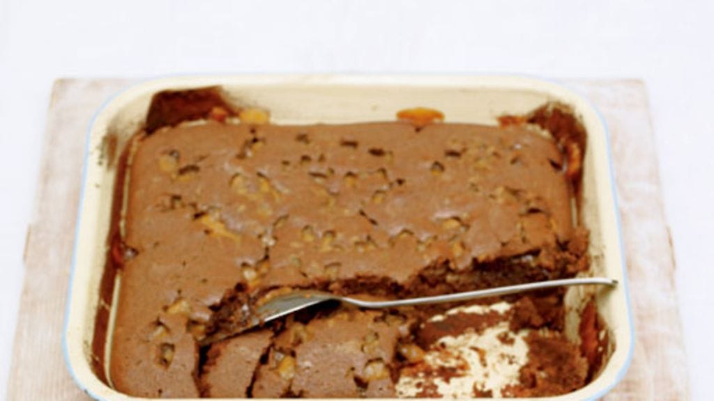 Valitse syvä vuoka (n. 25 x 25 cm). Voitele vuoka huolellisesti ja jauhota se lopuilla kaakaojauhoilla. Ravistele vuokaa, jotta se jauhottuu kauttaaltaan. Kaada kakkutaikina vuokaan ja kaavi lastalla kaikki taikina monitoimikoneesta. Paloittele fudge, levitä palaset taikinan päälle ja painele suurimpia paloja taikinan sisään. Pane vuoka uuniin ja kypsennä 18−20 minuuttia.