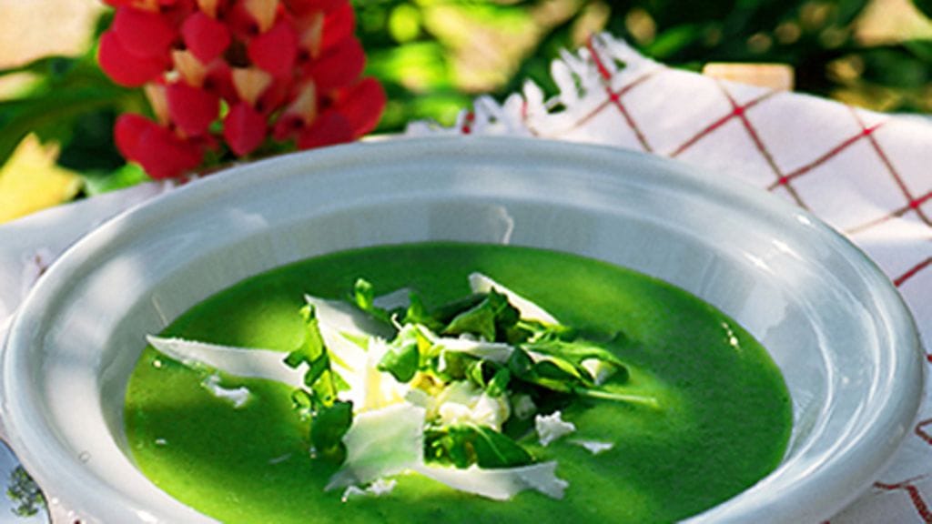 3 Kaada keitto takaisin kattilaan ja mausta suolalla ja pippurilla. Kaada keitto tarjoilukulhoihin tai syville lautasille ja valuta kauniisti kermaa annoksille.