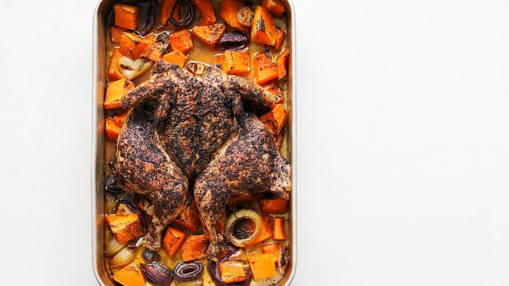 Kuori ja paloittele vihannekset, leikkaa valkosipuli poikittain kahdeksi puolikkaaksi. Levitä syvälle uunipellille. Pirskottele päälle oliiviöljyä, mausta suolalla ja lisää yrtit. Nosta avattu kana kasvisten päälle, hiero pintaan oliiviöljyä ja ripottele päälle toinen ruokalusikallinen suolaa sekä kuivat mausteet.