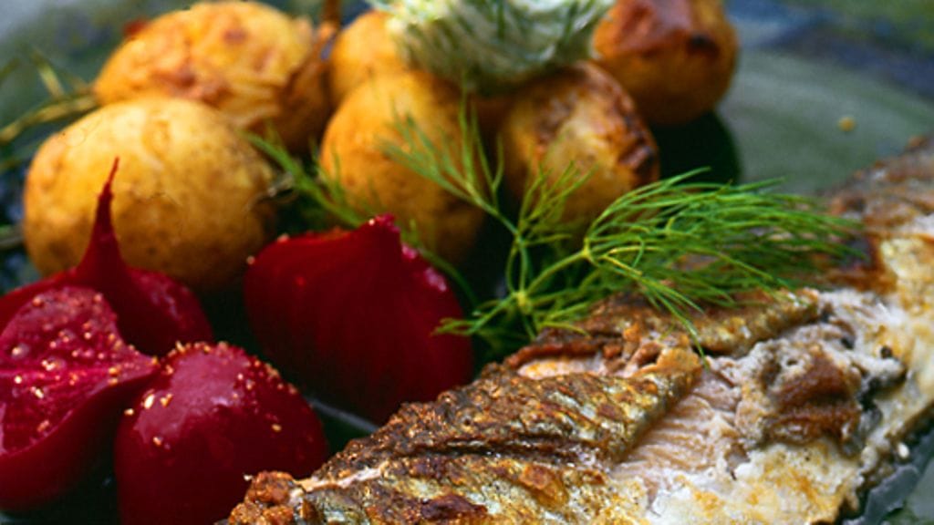 3. Penslaa kalat öljyllä. Laita ne halsteriin ja halstraa molemmin puolin harmaalla hiilloksella. Tarjoile lämpimiltä lautasilta lisukkeiden kera. Ripottele päälle hiutalesuolaa.