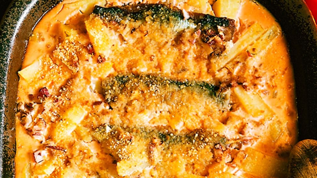2. Laita perunat voideltuun uunivuokaan, peitä perunapeti anjoviksella ja sipulilla. Vatkaa mäti ja kerma ja kaada vuokaan.