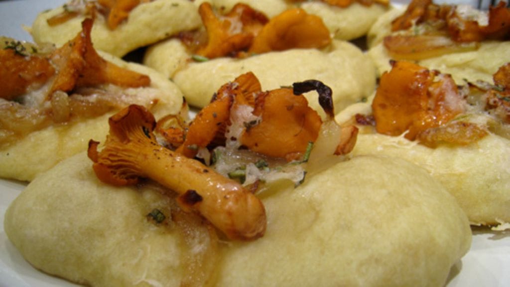 Voitele kukin pohja oliiviöljyllä. Nostele jokaiselle pohjalle sipulia ja sieniä. Mausta suolalla, pippurilla ja rosmariinilla. Ripottele pinnalle vielä parmesaania.