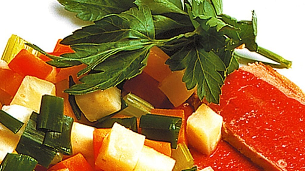 2. Poista lihaliemen pinnalle muodostunut rasvakakku. Kuori ja kuutioi vihannekset kauniisti. Keitä ne kypsiksi pienessä määrässä lihalientä.
