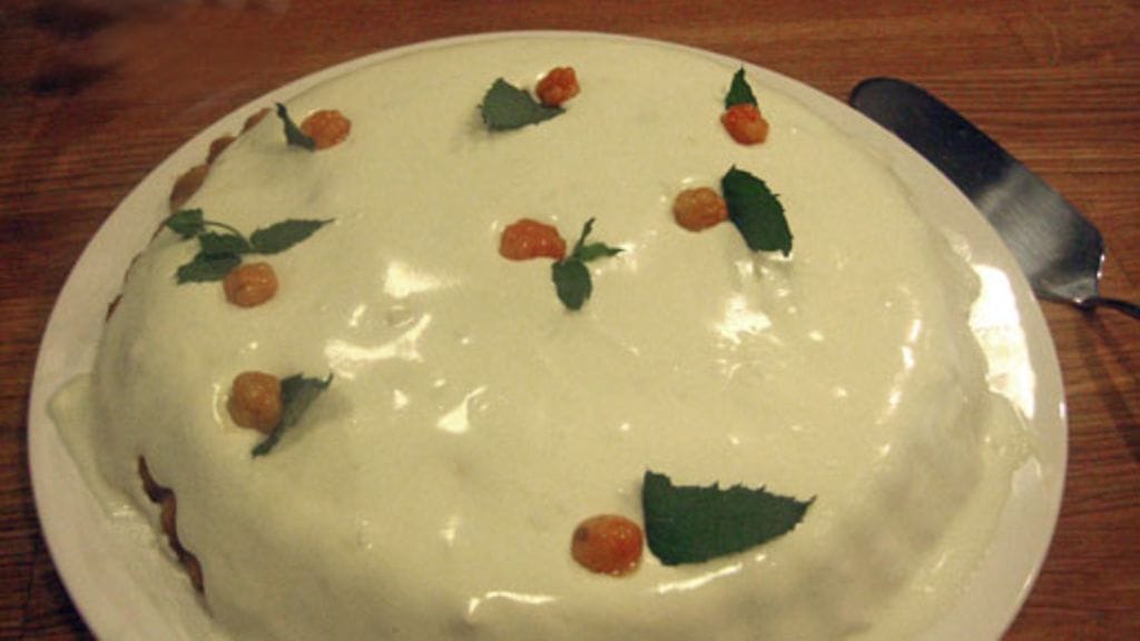 Valmista täytevaahto. Vatkaa vaniljakastike kovaksi vaahdoksi. Lisää huoneenlämpöinen eli hieman pehmennyt tuorejuusto tai maitorahka. Mausta seos sokerilla, vaniljasokerilla ja liköörillä tai esanssilla. Sekoita mantelilastut joukkoon.