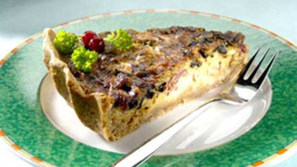 Kaada täyte päälle. Paista 225–asteisen uunin alimmalla tasolla puolisen tuntia, kunnes piiras on kauniin värinen ja hyytynyt.