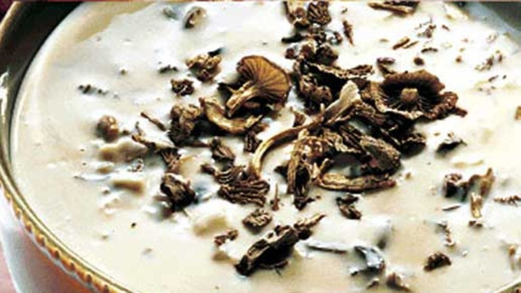 Kuullota hienonnettu sipuli ja silputut suppilovahverot öljyssä. Ripottele sipuli-sieniseoksen päälle ohrakas ja kaada mukaan kasvisliemi ja maito.