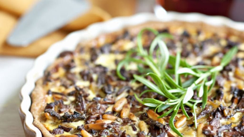 Levitä taikina pyöreän piirakkavuoan pohjalle ja reunoille tasaisesti. Valmista täyte paistamalla sienet ja silputut sipulit pannussa. Lisää siemenet ja mausteet. Paista kunnes sienistä irtoava liemi on haihtunut.