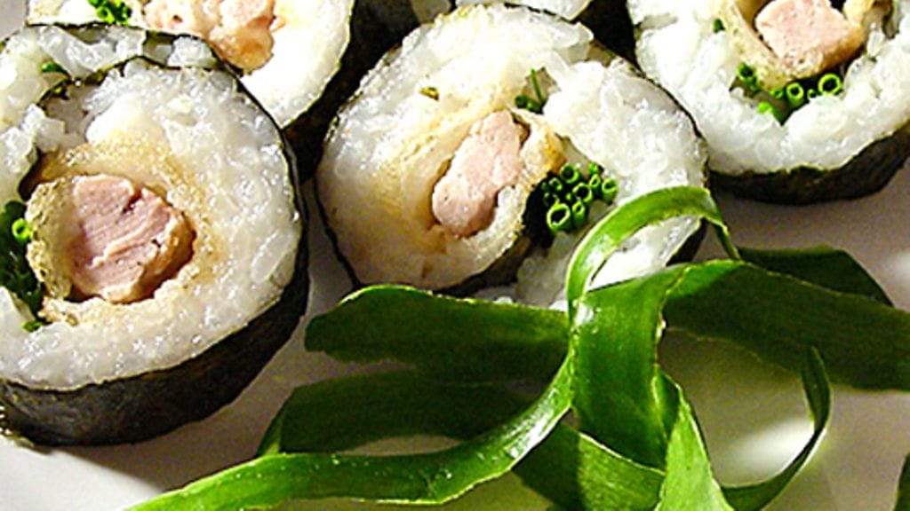 3. Laita päälle fileenauhat riviin sekä ruohosipulia. Kääri tiukalle rullalle ja liimaa saumakohta tilkalla riisiviinietikkaa. Leikkaa viipaleiksi terävällä veitsellä.