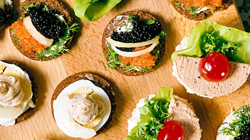 6. Kääntele voideltu leipä hienonnetussa tillissä, koristele punaisella ja mustalla mädillä ja punasipulilla.