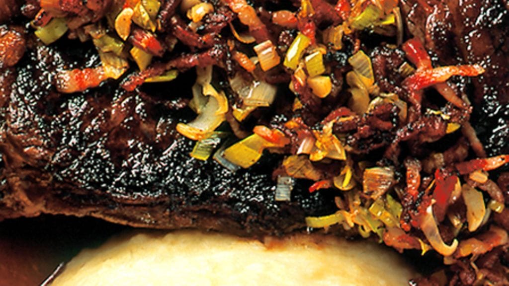 3. Nosta pihvit pannulta ja pidä lämpimänä. Jaa perunasose neljään vuokaan, nosta päälle pihvit ja pekonisilppu ja koristele ruohosipulisilpulla.