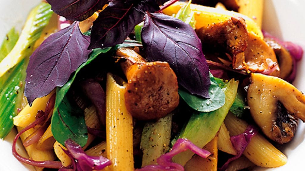 3. Kaada pasta sienten joukkoon ja sekoita. Valuta päälle oliiviöljy ja balsamiviinietikka.