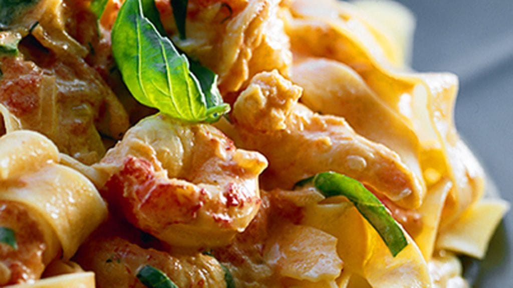 3. Kaada ravunpyrstöistä liemi pois, sekoita pyrstöt ranskankermaseokseen ja anna kaiken lämmetä. Tarjoile kastike vastakeitetyn pastan kanssa, ripottele päälle tuoreita basilikanlehtiä.