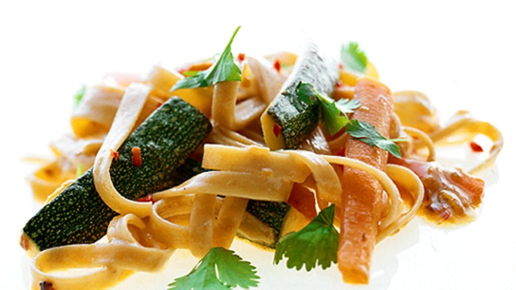 2. Kuori ja paloittele porkkana tangoiksi, paloittele kesäkurpitsat samoin. Paista porkkanaa öljyssä 5 minuuttia. Lisää kesäkurpitsa viimeiseksi minuutiksi. Lisää chili ja purista mukaan valkosipuli.