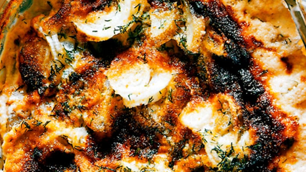 1. Kuumenna uuni 200 asteeseen. Lado peruna- ja sipuliviipaleita kerroksittain uunivuokaan. Suolaa ja pippuroi.
