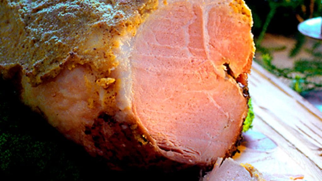 3. Kuumenna uuni 275 asteeseen. Sekoita keskenään muna, sinappi sekä sokeri ja levitä seos tasaisesti kinkun pinnalle. Siivilöi päälle korppujauhoa ja taputtele sitä hieman kiinni sinappiseokseen. Kuorruta kinkkua uunissa n. 10 minuuttia, kunnes se on kauniin värinen. Ole tarkkana, ettei pinta pala! Anna kinkun jäähtyä kunnolla ja nosta se sitten jääkaappiin. Leikkaa kylmästä kinkusta ohuita viipaleita tarjolle tuotaessa.