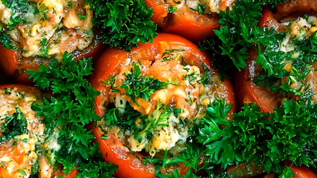 3. Täytä tomaatit. Laita ne uunivuoassa 225-asteisen uunin keskitasolle 15-20 minuutiksi.