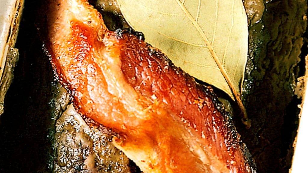 3. Kaada taikina yhteen tai useampaan korkeareunaiseen vuokaan. Peitä foliolla, johon teet muutamia ilmareikiä. Paista vesihauteessa uunin keskitasolla n. 1 tunti. Poista folio paistamisen lopussa niin että pinta saa hieman väriä. Peitä ennen tarjoilua kevyesti paistetuilla pekoniviipaleilla.