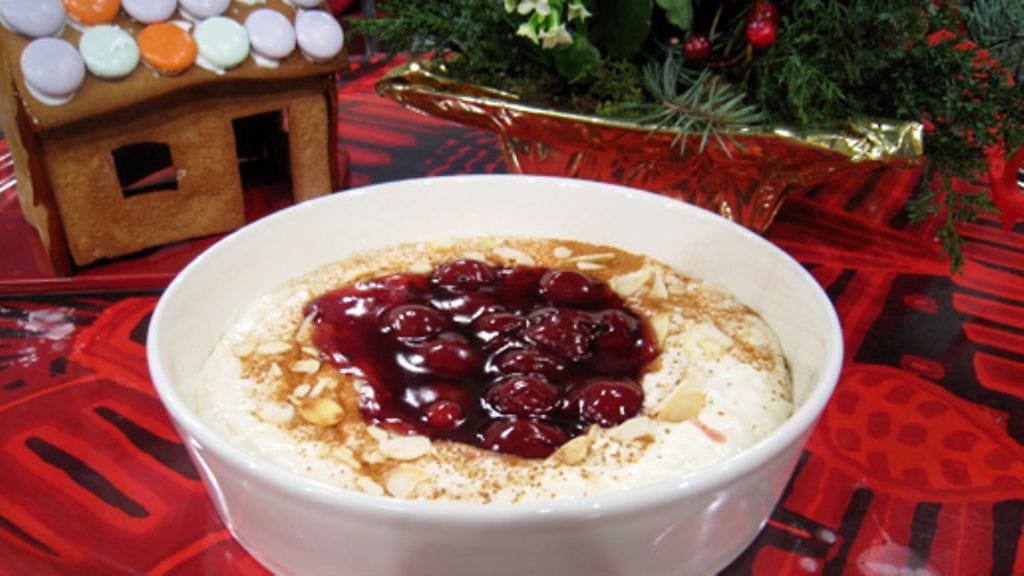 Vatkaa kerma vaahdoksi vaniljasokerin kanssa. Sekoita se kylmään riisipuuroon. Lisää joukkoon hieman kanelia, paahdetut mantelilastut ja kokonainen manteli.