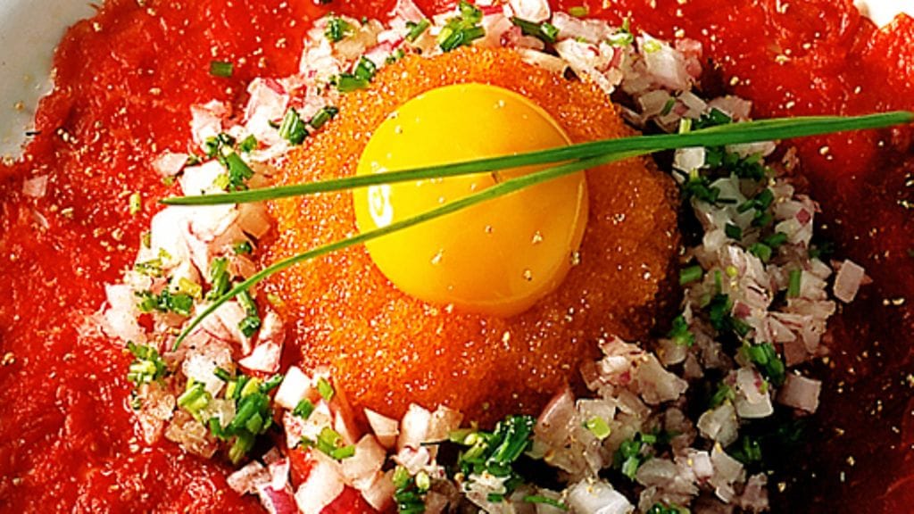 2. Pane leivät lautasille ja lihaviipaleet leipien päälle. Asettele muikunmätiä lihaviipaleiden keskelle ja ripottele ympärille hienonnettua sipulia. Tee mätikekoon kuoppa ja kaada munankeltuainen kuoppaan. Koristele ruohosipulinvarsilla. Rouhi myllyllä pinnalle muutama kierros valkopippuria.
