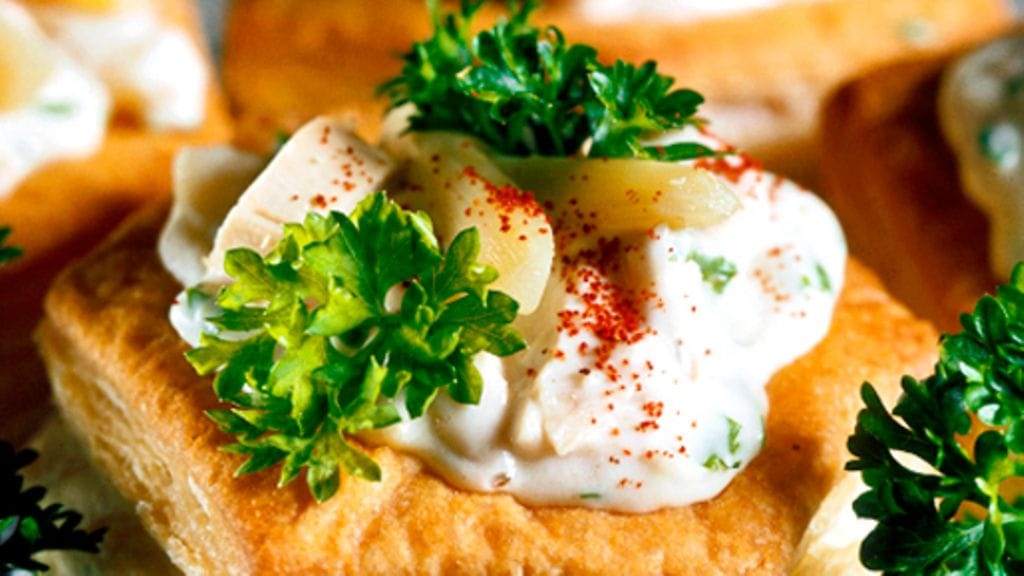 4. Täytä lämpimät pasteijat muhennoksella ja koristele parsalla sekä tillillä.