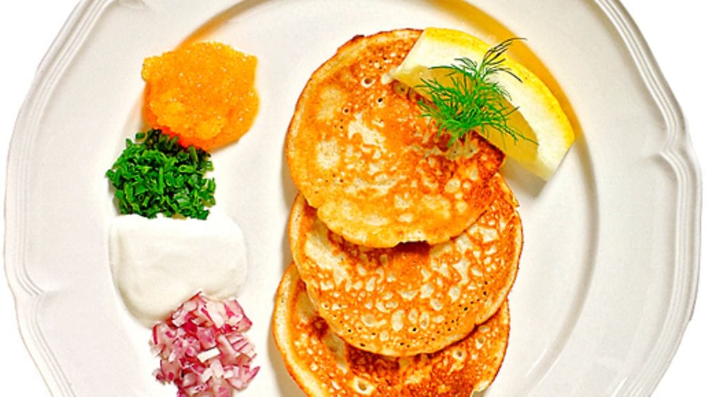1. Lämmitä maito kädenlämpöiseksi (37 astetta). Liuota hiiva maitoon ja sekoita joukkoon tattari- ja vehnäjauhot vähän kerrallaan. Anna taikinan turvota huoneenlämmössä vähintään tunnin ajan. Erottele kananmunien keltuaiset ja valkuaiset. Pane valkuaiset jääkaappiin. Lisää taikinaan yksi keltuainen, mausta suolalla ja sekoita hyvin.