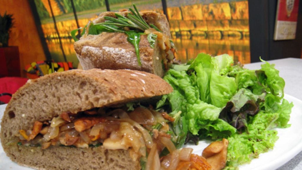 Halkaise patonki taskuksi ja ripottele väliin oliiviöljyä. Paista patonki kypsäksi ja ota pois uunista. Täytä sienipaistoksella. Laita väliin vielä pestyä rucolaa ja parmesanlastuja. Tarjoile raikkaan salaatin kanssa.