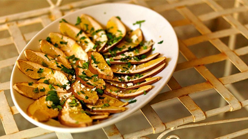 3. Laita tattiviipaleet lautaselle ohuelti ja mausta sitruunanmehulla, oliiviöljyllä ja hippusella suolaa. Murenna päälle juusto ja hienonna lehtipersilja.