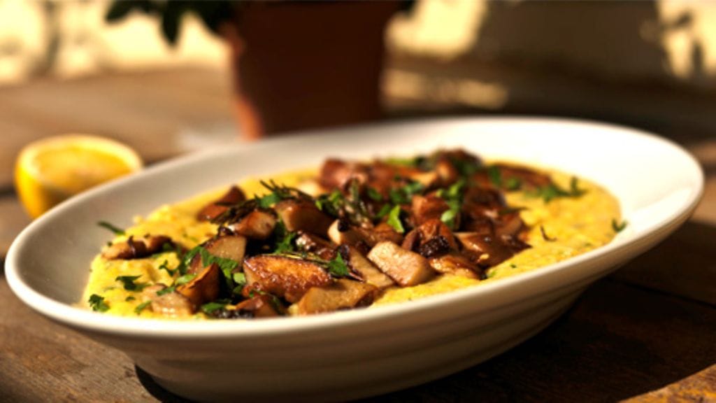 5. Viimeistele polenta parmesanjuustolla ja voi nokareella. Mausta sitruunanmehulla ja suolalla.