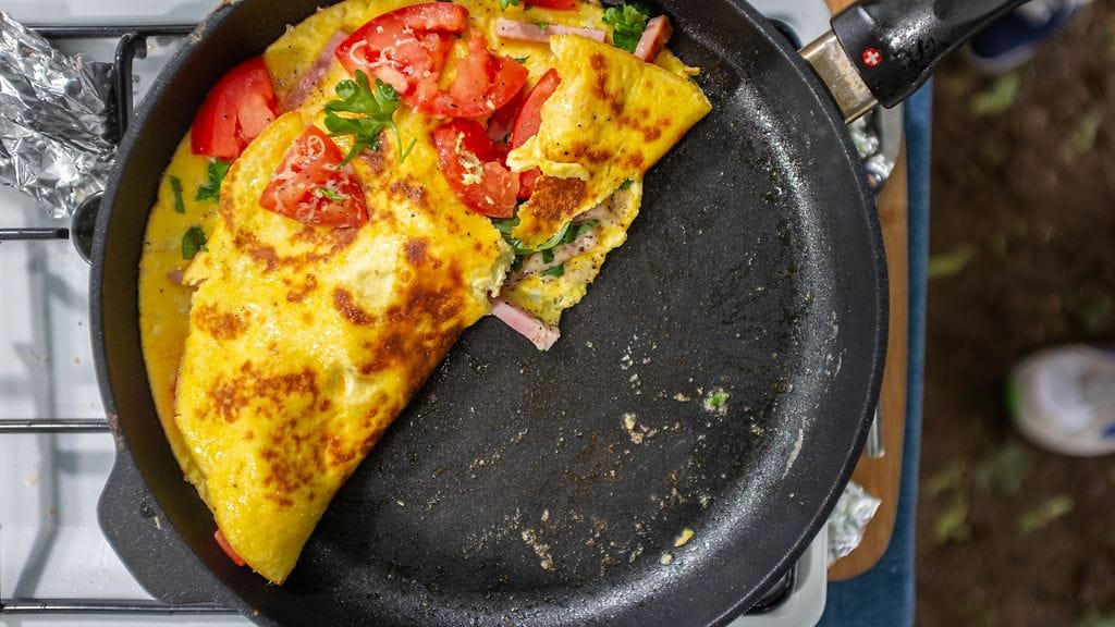 - Sulata pannulla voinokare, kaada munakasmassa pannulle ja anna kypsyä miedolla lämmöllä . Kun munakas on hieman hyytynyt, ripottele päälle kuutioitua tomaattia, kinkkusuikaleita sekä juustoraastetta.